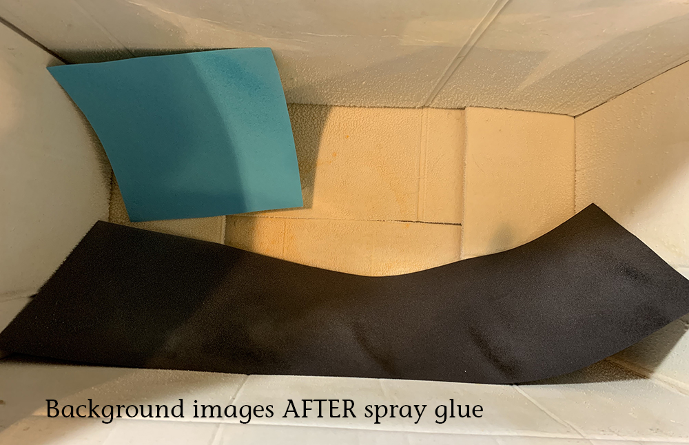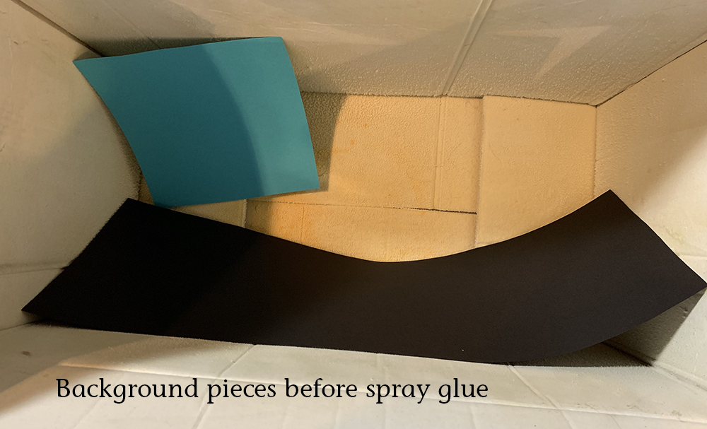 You can also use large sheets of double-sided adhesive. Again, I can buy these at Jerry’s in person, but not online. I may move more to this for the background in the future because I’ve inadvertently warped too many pieces of foam core.