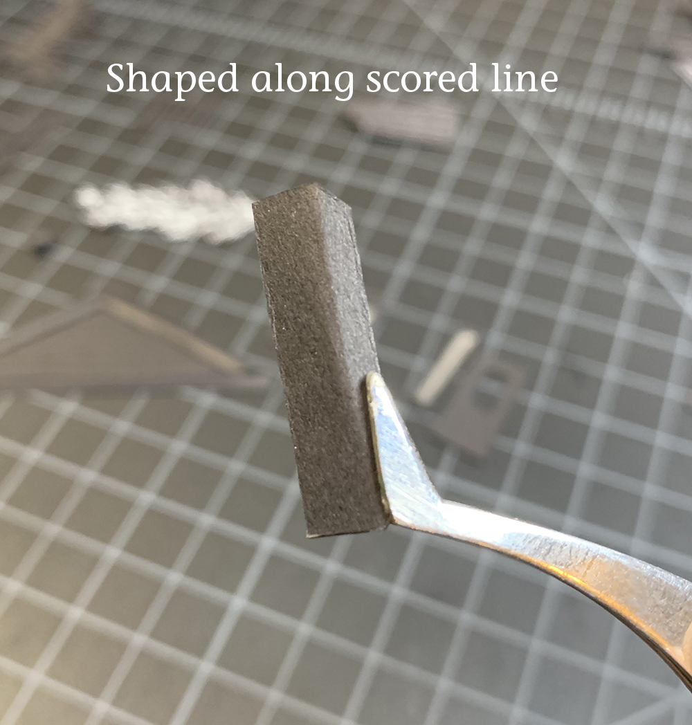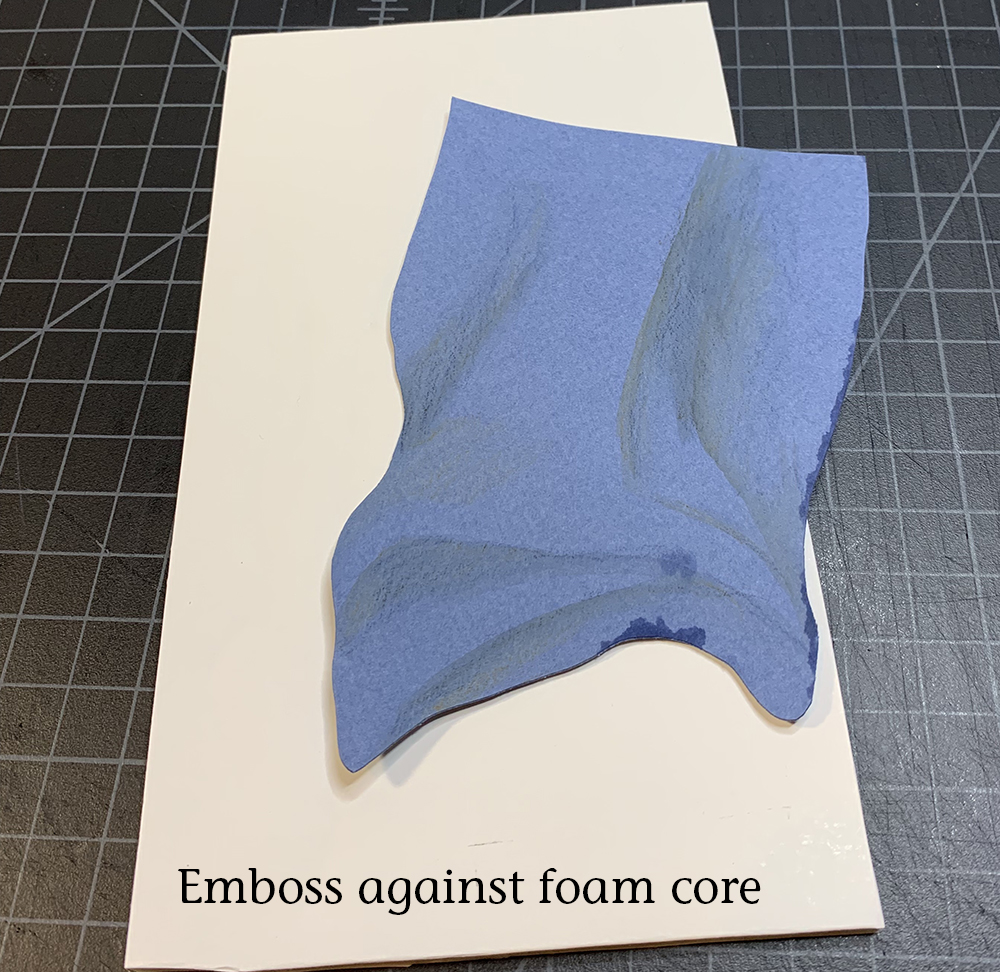Reinhard suggested using a piece of foam core. We actually conducted several experiments together with various surfaces to emboss against, and the foam core was the best. Fortunately, because I use foam core to back my pieces, and they vary in size, I always have random bits of foam core around. It will break down as you emboss against it, and then can be cut up to add support to the final sculpture (detailed in later post).