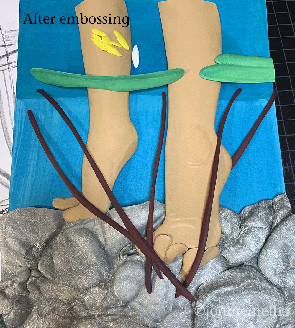 I demonstrate how to shape and emboss cut paper sections to form paper sculpture. I work on smaller lines and folds on the legs and feet from "The Star Maiden".
