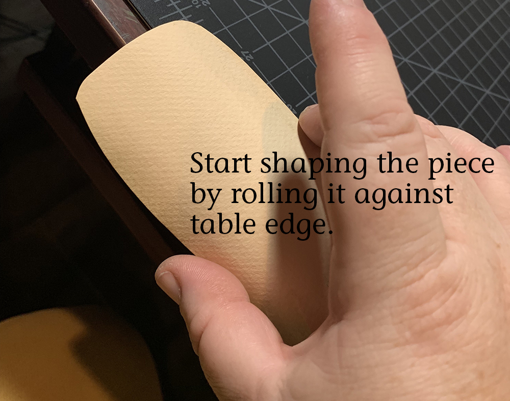 I almost always start any shape by rolling it across the edge of my desk. This helps create the basic shape of the piece (and probably loosens the paper fibers somewhat). I don’t do this for pieces smaller than a couple of inches though.