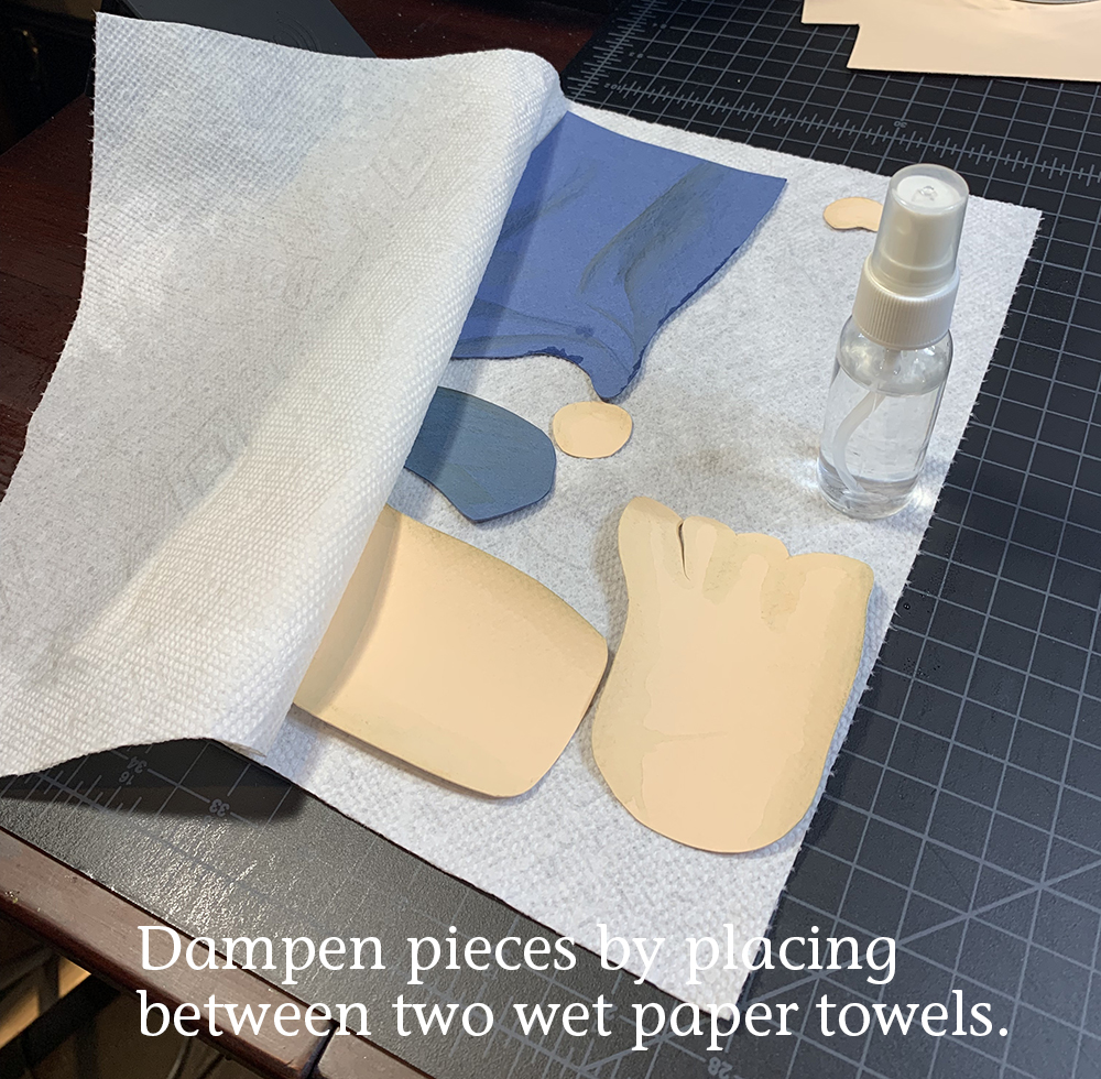 This was one piece of advice that was invaluable in my meeting with Reinhard. I had wondered if the paper needed to be wet to be embossed, and how wet to make it. (I would have made it too wet). Reinhard said to spray wet (not soaking) two pieces of paper towel, and then put the pieces of cut paper between the paper towels. It doesn’t take long – even just five minutes depending on the stiffness/thickness of the paper.