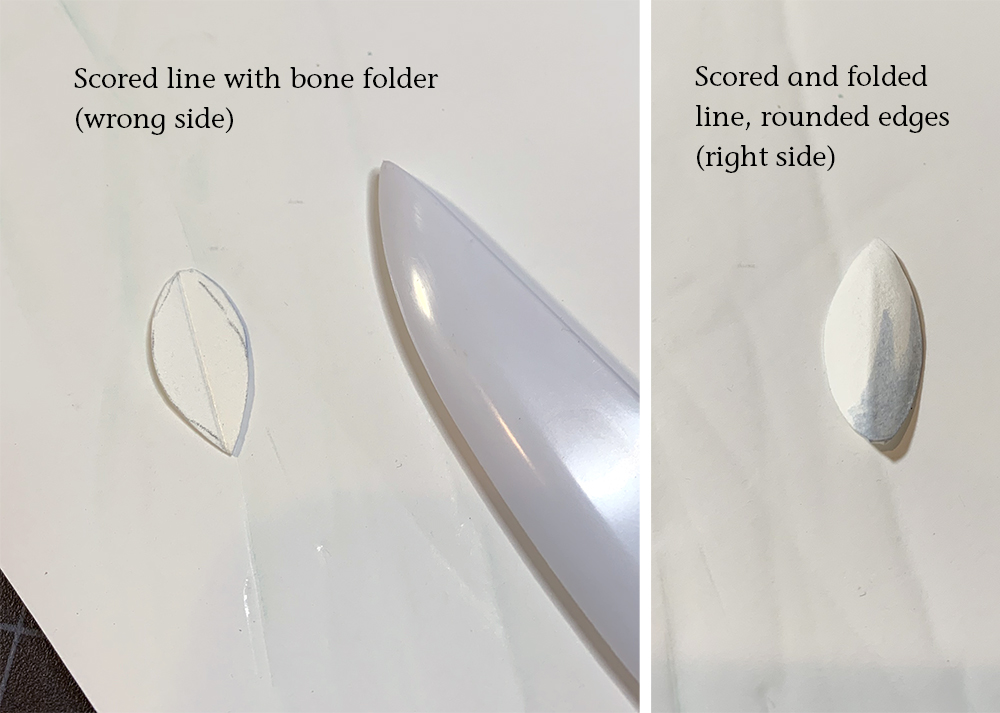 I will try to emboss smoothly for detailed areas. However, sometimes you want a deliberate line, which you will “score” on to the front or back using the fine edge of a bone folder or a small embossing tool.