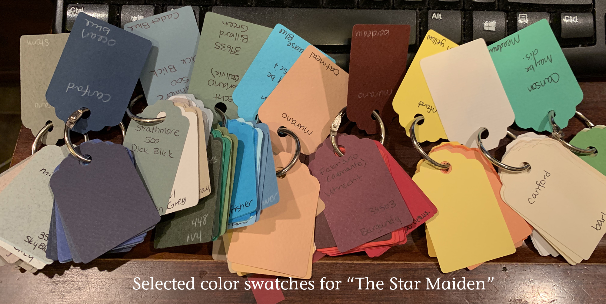 I had pulled out this blue for “The Star Maiden”. The swatch I had was a very muted color. However, the piece I now had was much more vibrant. Obviously, the old swatch had faded. Fortunately, I had enough of the faded sample (which was more my preference) for this piece. But I cut a new swatch from the newer paper so that I had a more accurate representation going forward.