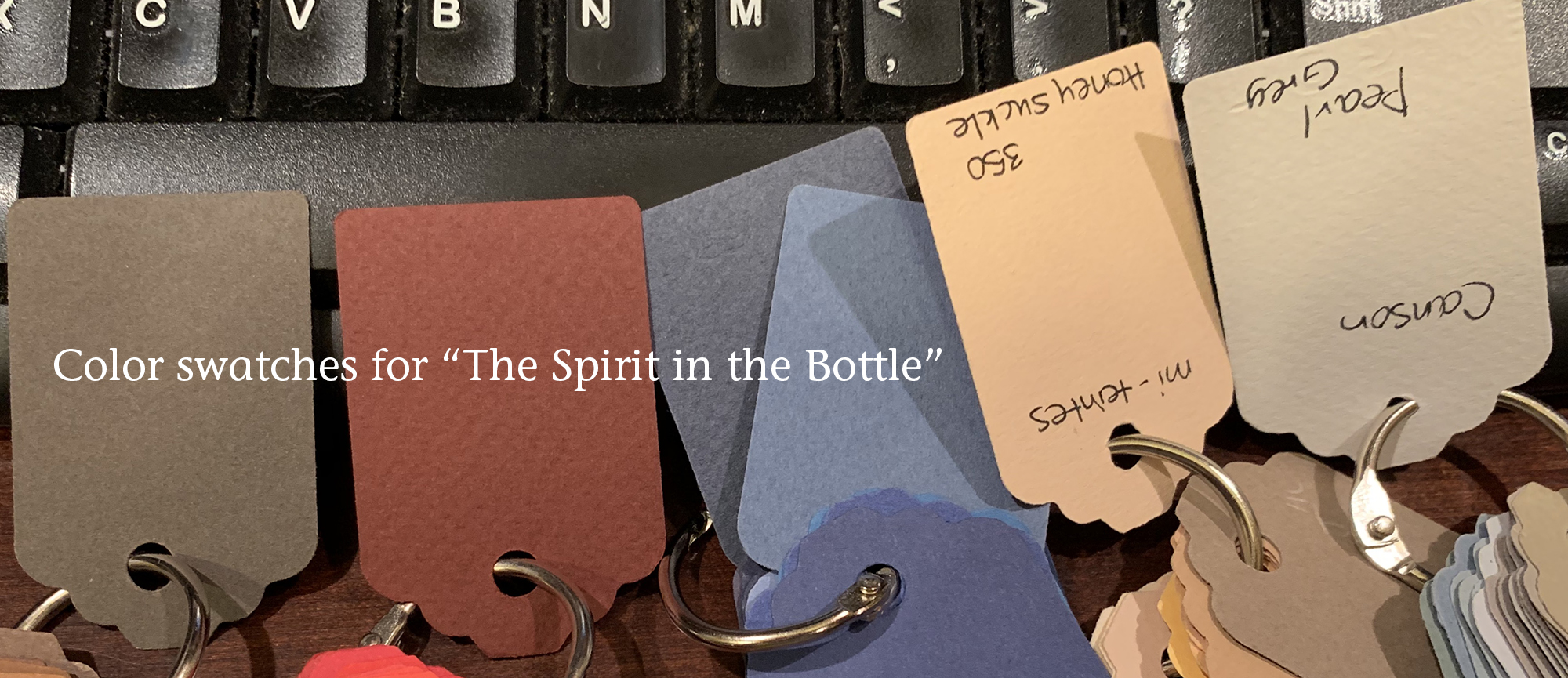 For “The Spirit in the Bottle”, I didn’t pull out a brown for the forest floor because I want to use Tyvek – I know it will give a textural effect and that I’ll have to ink it myself. I kept the swatches for a blue and a brown to use as a reference for the background colors.