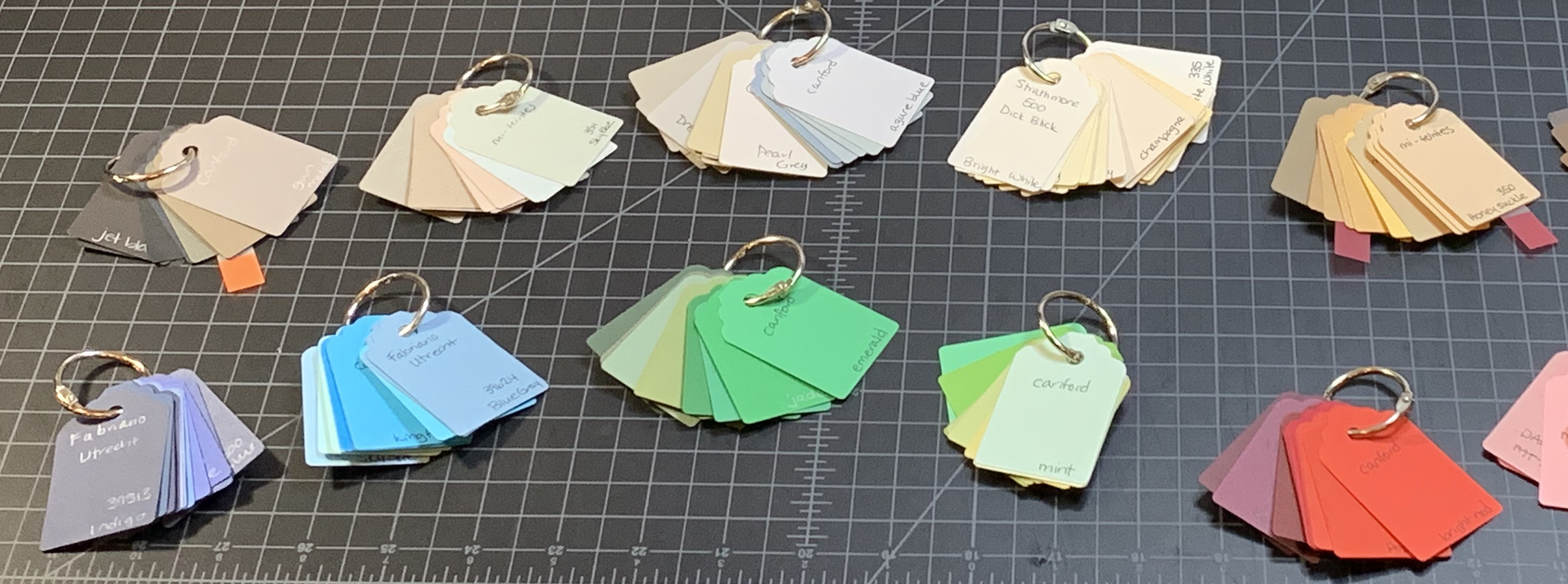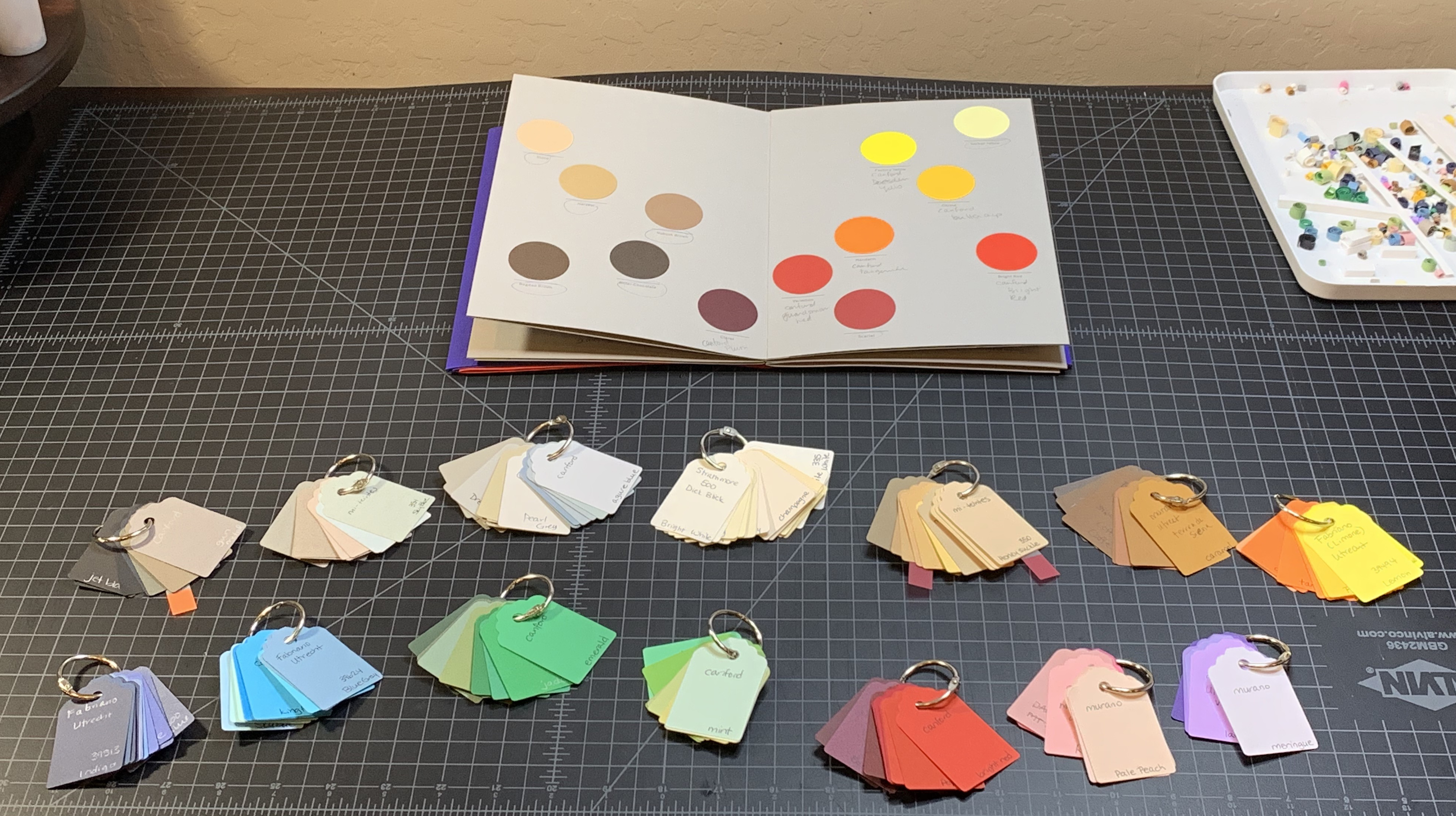 It took a day or two initially to create these swatches, but they are invaluable now. I can lay out the color next to the monitor to see approximately which base colors I want to start with. I can then select colors and see how they work next to each other. And finally, I put a post-it tag on the samples I’ve used up so that when I go to the store or online, I know which papers I need to buy more of.