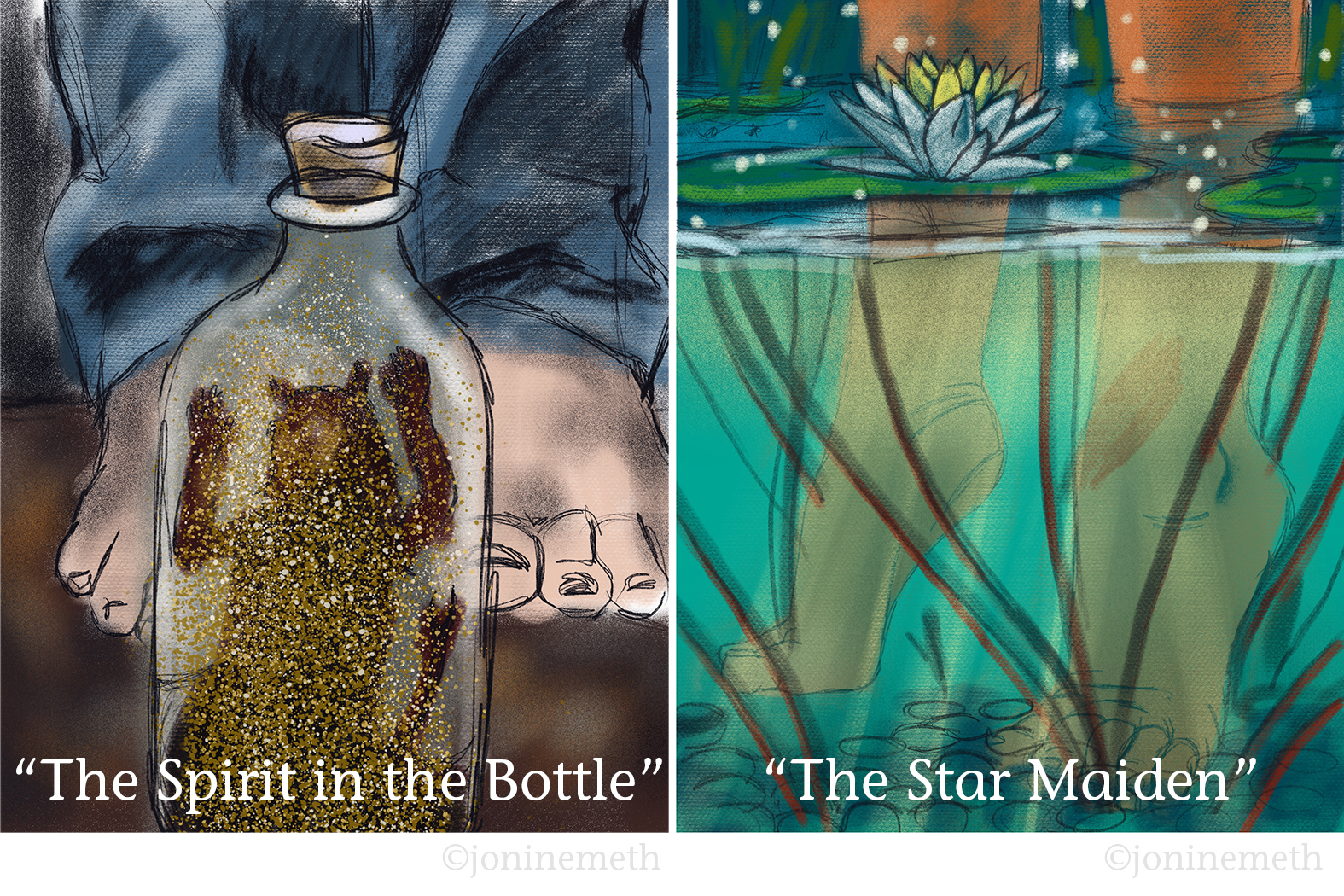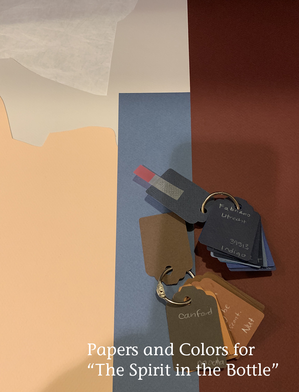 This is a more limited palette than for “The Star Maiden” because I know that the accent colors are going to be added through ink rather than paper, forming the gilding on the bottle.