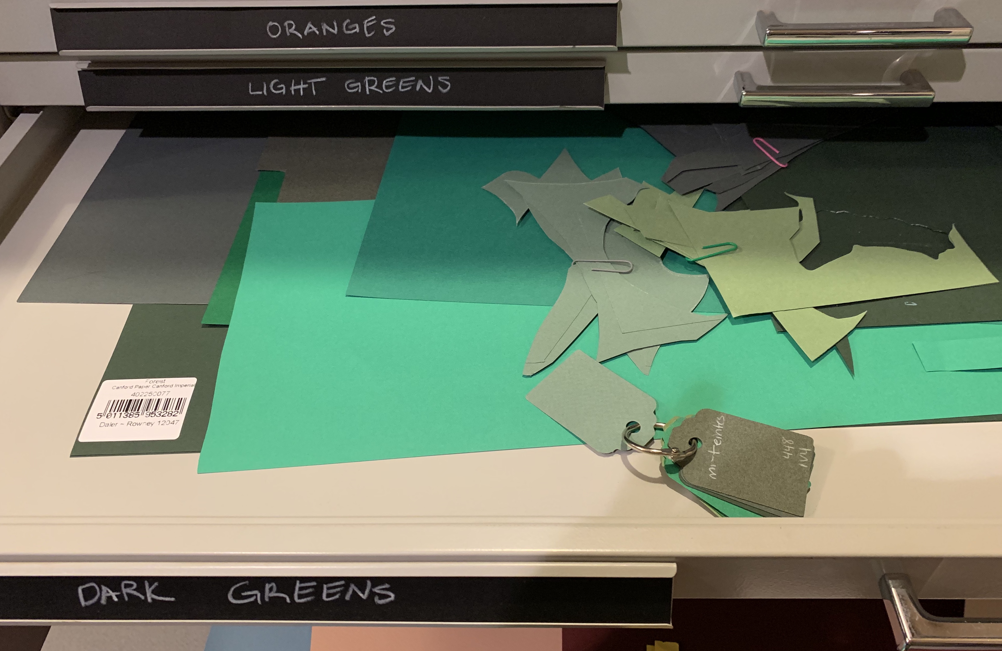 With how my studio is organized, I can then take the ring of color with appropriate tag selected to the corresponding drawer, and find the larger paper I'm looking for. I used to file the papers in a certain order (but that was madness!), but now I just try to keep smaller pieces on top, larger on the bottom.