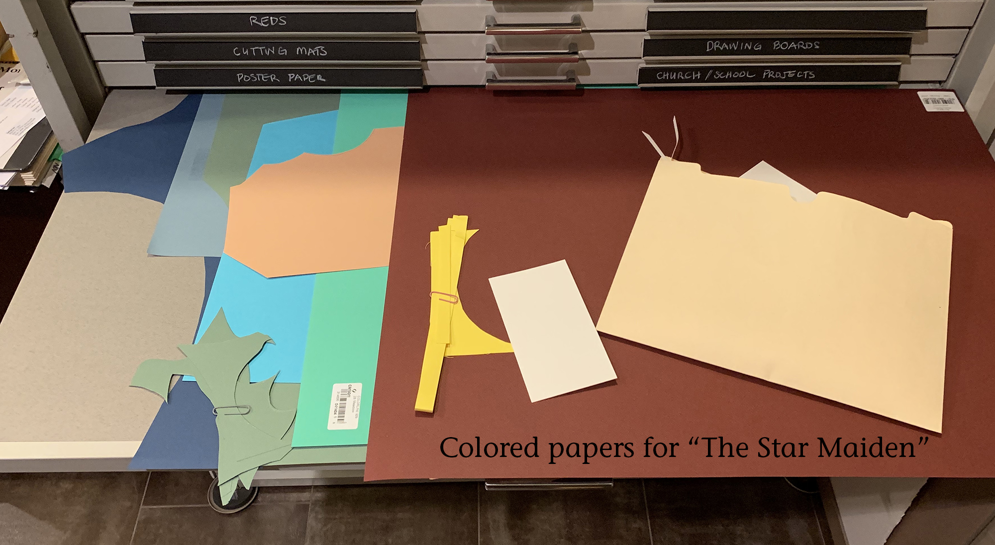 These are the final color selections for “The Star Maiden”. I’m going a little darker, more vibrant on the color for the water background, because I know I want to play with overlays that will both lighten and desaturate the background paper. (And how much do I love that pull out shelf to lay the papers on?!)