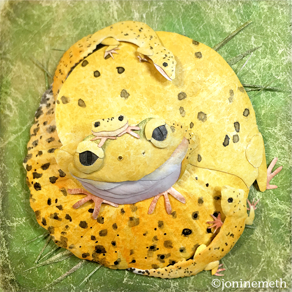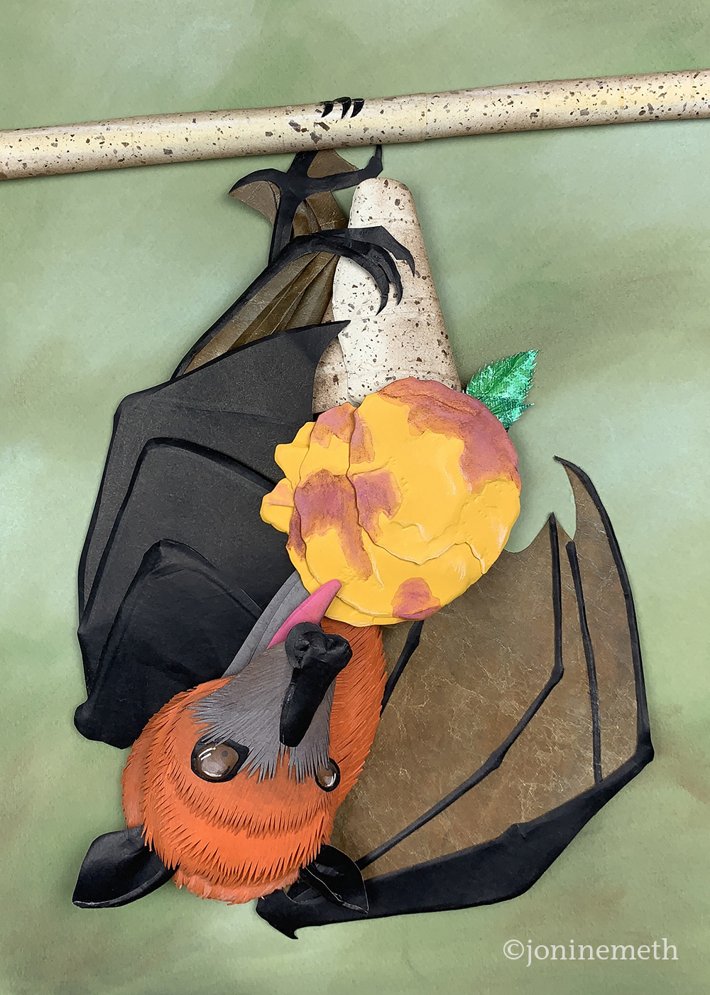 I did some various studies and completed two small paper sculptures (click on the images to enlarge). The first one, "The Geckos", is completely out of Tyvek (except for the back support). The second one, "The Flying Fox", has Tyvek on the wings, ears, and leaves, while the rest was built using my more standard approach to paper sculpture.
