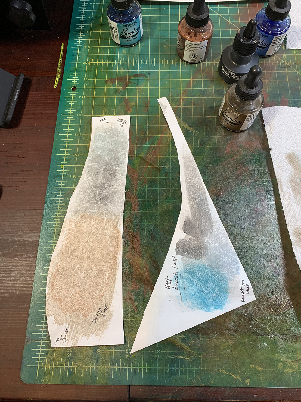 I knew that I wanted to do a blend of blue/Black Magic for the top of “The Spirit in the Bottle” background, and a blend of Van Dyke Brown and Sepia for the forest floor bottom. For the river rocks in “The Star Maiden” I wanted some aqua tones overlaying a gray undertone. I used some scrap pieces of Tyvek to do some color testing before working on the actual background papers.