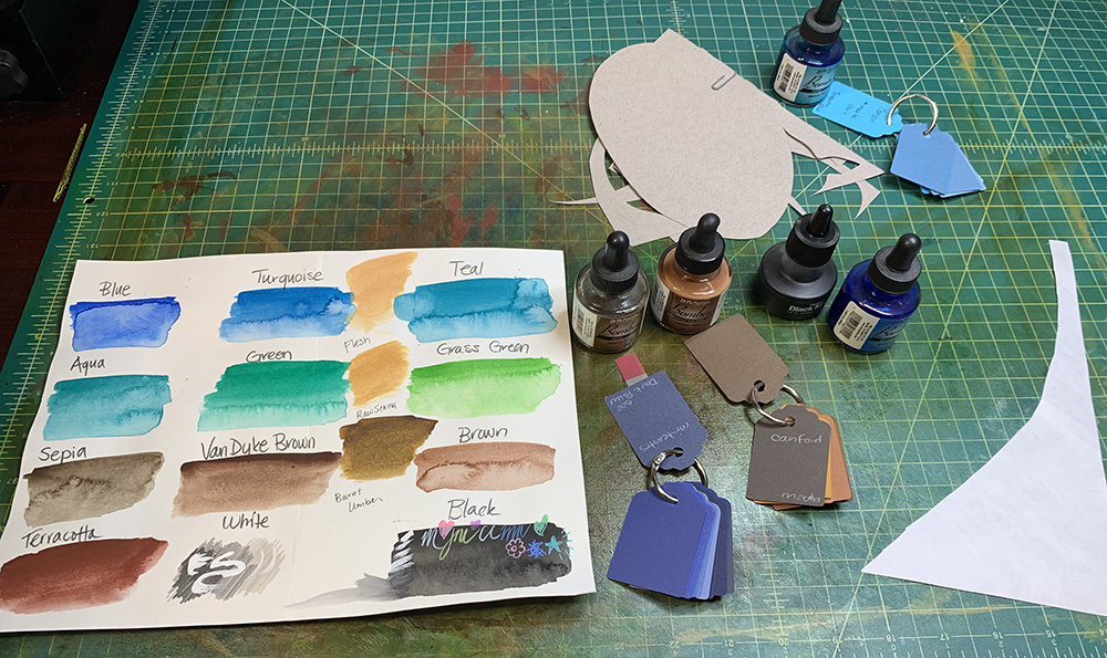 I began by comparing my selected swatch colors against my chart of Dr. Martin’s Bombay inks. I like the concentrated strength of these inks. For a deep waterproof black, I use Black Magic. (I create a color chart like this for all my materials – it’s a little time-consuming at the outset, but invaluable to have as a resource).