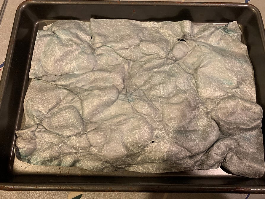 3) use a heat gun. Be careful – you can easily scorch the paper. (You can see three scorched areas below). A blow dryer might work also. It literally took 30 seconds bubbling the paper with this method!