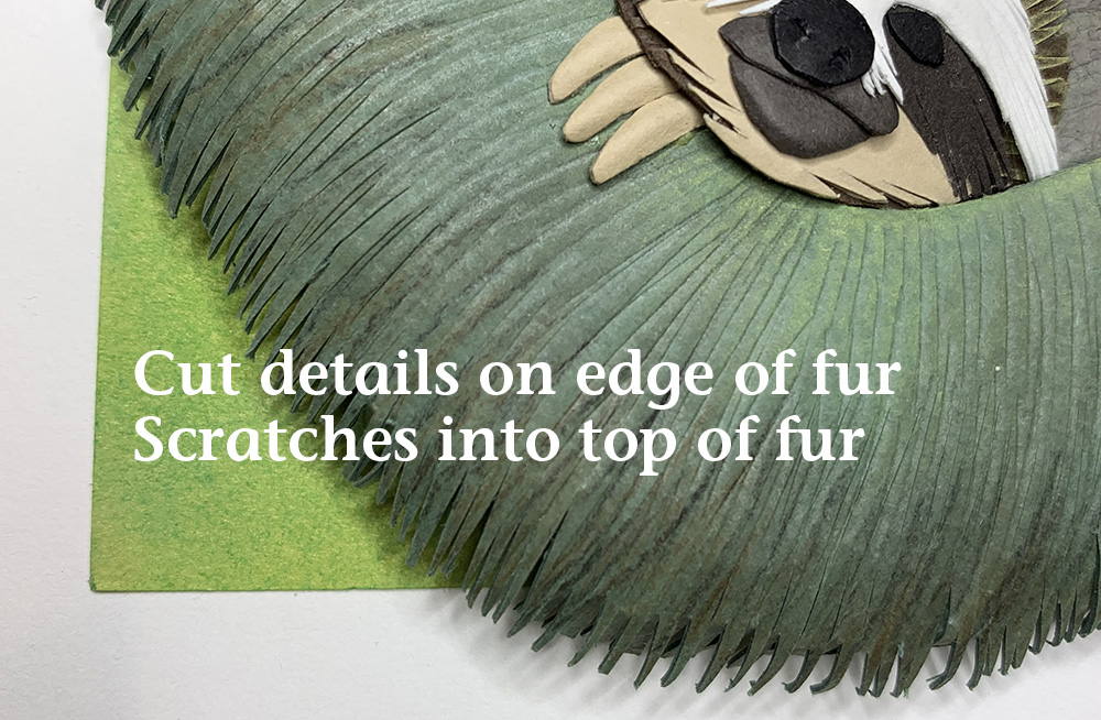 One technique I’ve recently started playing with for fur is cutting the edge of the paper, but not cutting through the triangles (if that makes sense). Rather then pulling out the negative space between the cuts, I push it through (because I haven’t connected the top cuts). This allows me to give a more rounded edge (see the bottom edge of the sloth arm).