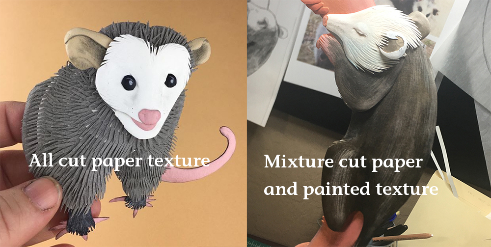 I recently completed some sample baby opossums for a picture book of mine. I initially created all the fur texture from cut paper. I felt that this was too harsh a technique, however, and moved to a combination of cut edges with painted areas. (Plus all cut paper fur would have taken FOREVER!!!)